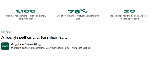 For context: a 75% live show-up rate for a B2B webinar is the kind of thing that makes industry veterans laugh in disbelief. Typical show-up rates hover around 30–40%. And this happened during the holiday season. On a Wednesday morning.