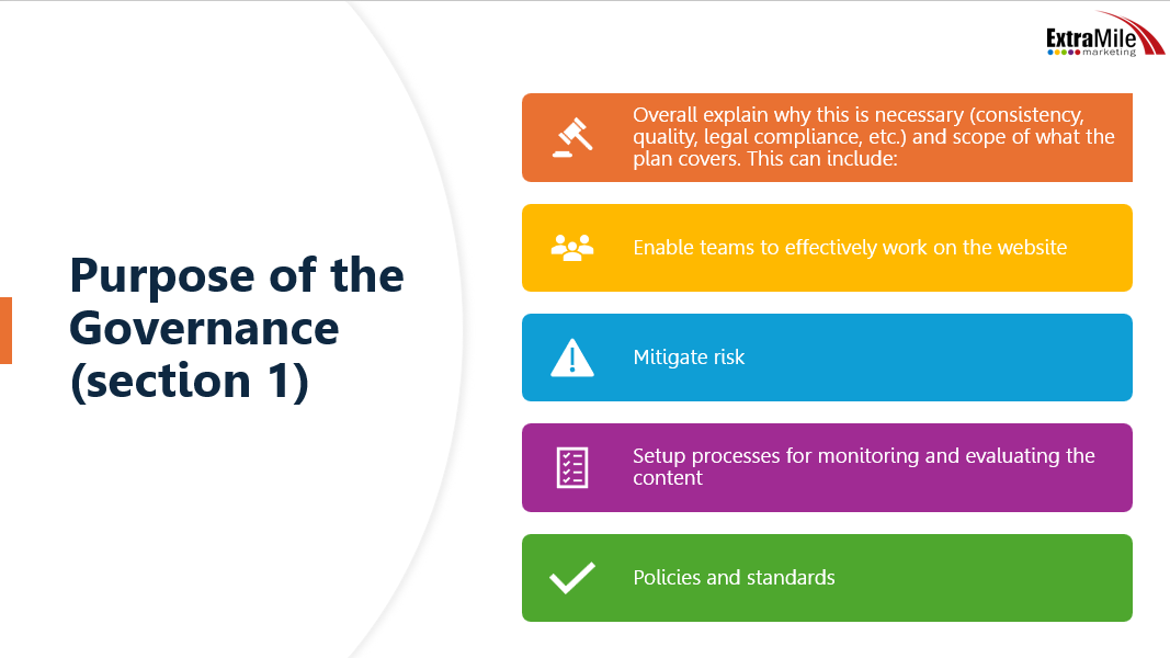 The final governance framework includes more than 13 detailed sections, covering everything from technical standards, branding guidelines, and SEO strategy to risk management, analytics, and change management. It establishes clear decision-making pathways, training requirements, and a roadmap for continuous improvement.